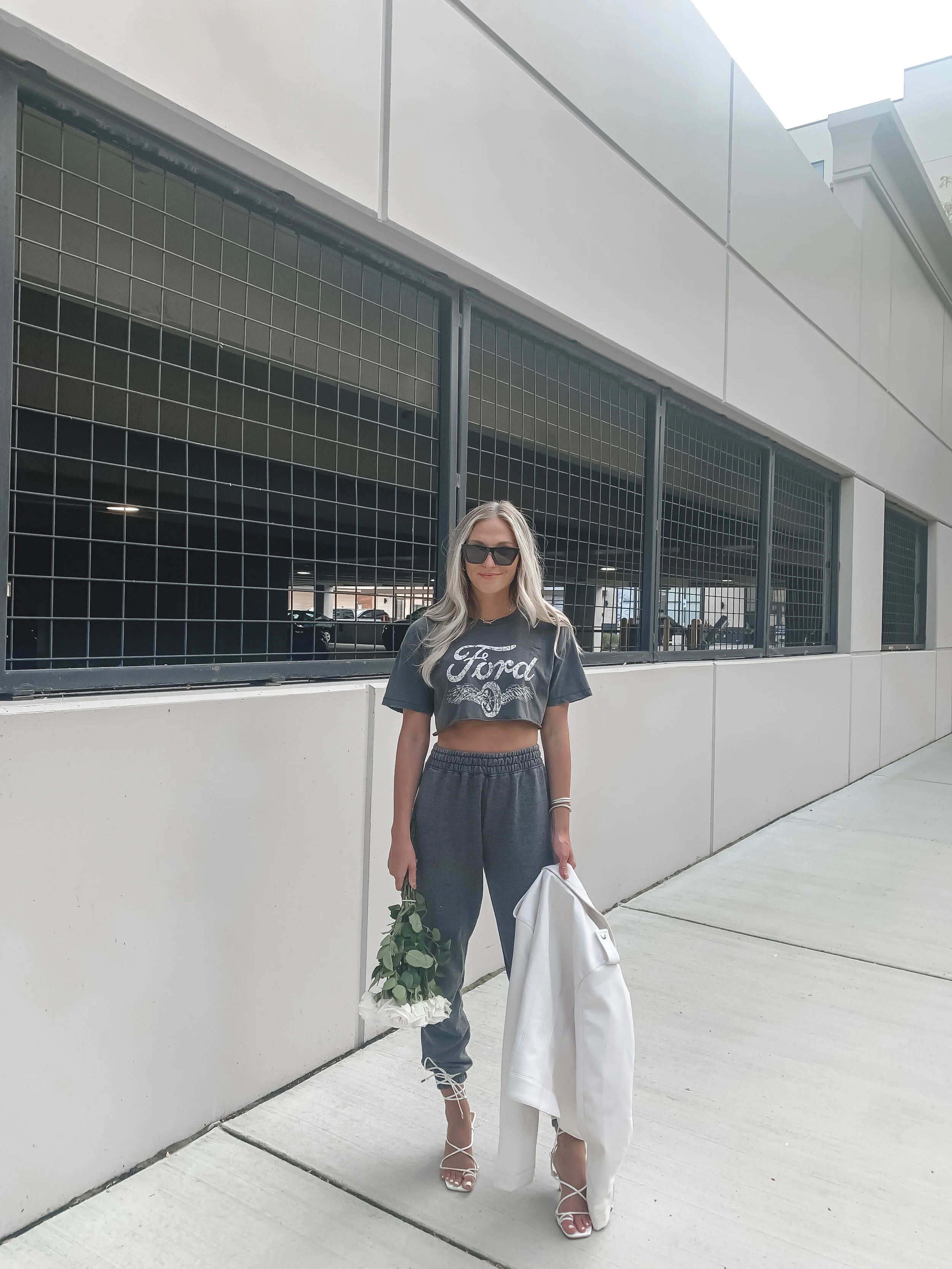 Sweats are one of my favorite and most worn ways I pair graphic tees with. Feeling’ a little Kardashian like when I pair it with heels!! This lace up pair are super affordable! I went with a cropped graphic tee to show a little skin since I’m basically covered everywhere else, and a white leather jacket to layer. Sweats & graphic tees are also perfect while at home and lounging— makes me feel like I’m still a little stylish.