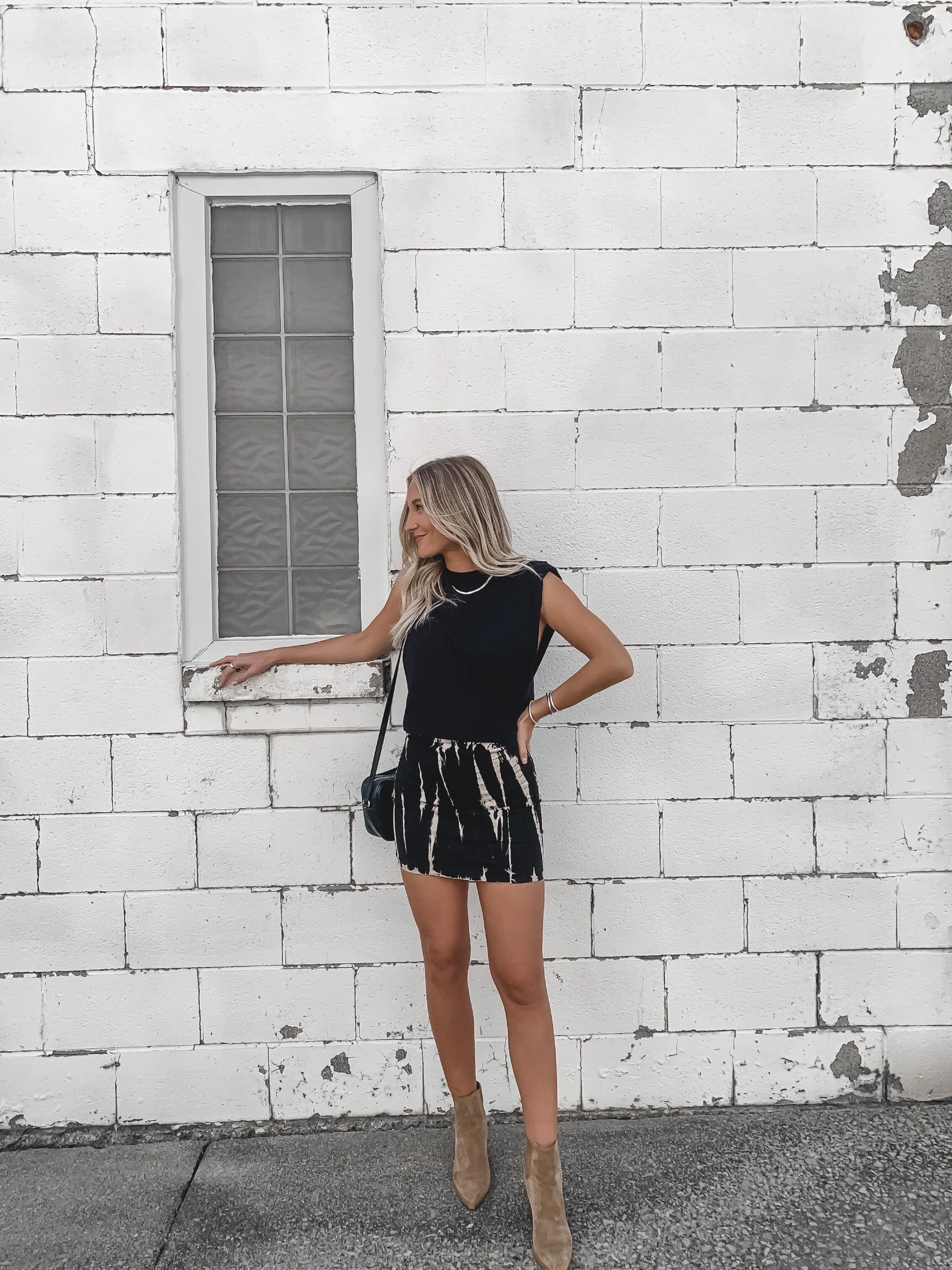 The first look features a black muscle tee. I found this one on Nasty Gal for a super affordable price (mine is only $10!). I paired it with an acid wash/tie dye vibe skirt, fall booties and gold accessories. The skirt I’m wearing is actually 30% off right now!